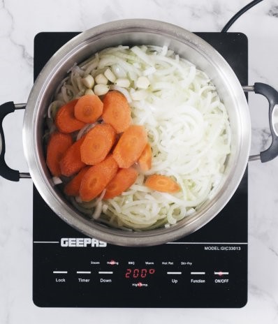 ۲. زمانی که پیازها سبک شدند، هویج خرد شده و سیر را به آن اضافه کنید و باز تفت دهید.