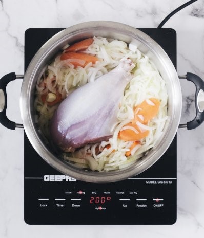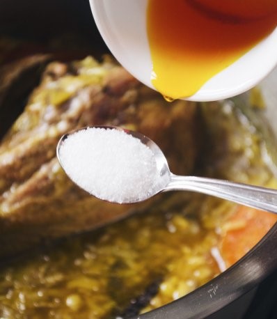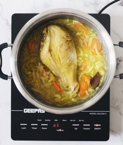 ۴. بعد از این که هر دو طرف ران بوقلمون را تفت دادید، تمام ادویهها به جز نمک را به همراه یک لیوان آب جوش به آن اضافه کنید. در همین مرحله نیمی از زعفران دم کرده را هم روی بوقلمون بریزید و اجازه دهید برای مدت ۳ تا ۴ ساعت با حرارت ملایم بپزد.