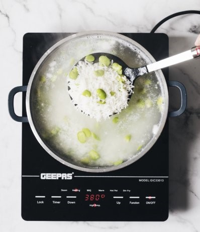 ۵. ۳ پیمانه برنجی که قبلا خیساندهاید را بجوشانید. باقالیها را نیمپز کنید. همانطور که برنج در حال جوشیدن است، باقالیهای نیمپز را با آن مخلوط و سپس آبکش کنید. بسیار مهم است که برنج شما از قبل خیس خورده باشد.