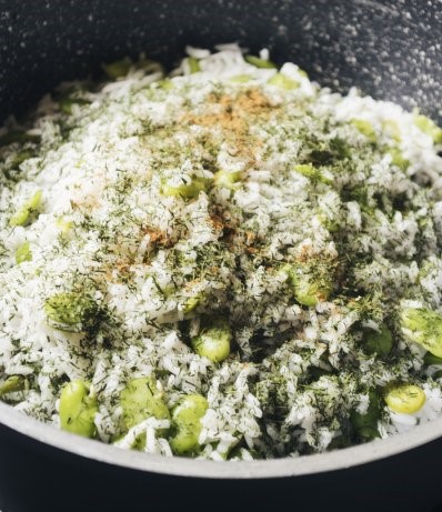 ۶. برای دم کردن باقالی پلو اول تهدیگ مورد علاقه خودتان را کف قابلمه قرار دهید، سپس برنج و باقالی آبکش شده، شوید خشک و در صورت تمایل کمی دارچین را به صورت لایه لایه در قابلمه بریزید. در آخر هم میتوانید کمی از زعفران دم شده را روی برنج بریزید. در قابلمه را بگذارید تا برنج دم بکشد.
