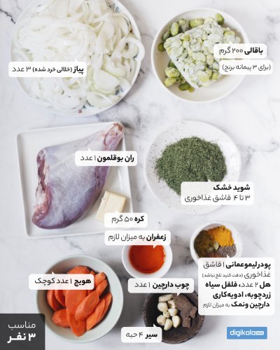 مواد لازم برای باقالی پلو با بوقلمون (برای ۳ نفر)